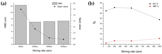 The effect of stirring rate during the SFEE process on the properties of BSA-loaded PLGA microspheres prepared via the SFE process at 35 °C and 85 bar; (a) particle size and distribution; (b) EE and IBR.