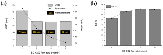 It was observed that the particle size and SPAN value increased, while the EE decreased, at low stirring rates or SC-CO2 flow rates (Figure 10 and Figure 11). The proposed rationale for this decrease in extraction efficiency was the delayed formation of the outer shell and/or the less compact outer layer of the PLGA microspheres, potentially leading to the loss and diffusion of the inner drug into the outer phase. This low mixing/extraction efficiency could have also led to the slow formation of a dense thin layer of PLGA, thereby promoting the greater coalescence of emulsion droplets. In addition, the higher extraction efficiency at an increased SC-CO2 flow ratio resulted in lower residual solvent content in the PLGA microspheres [26,63].