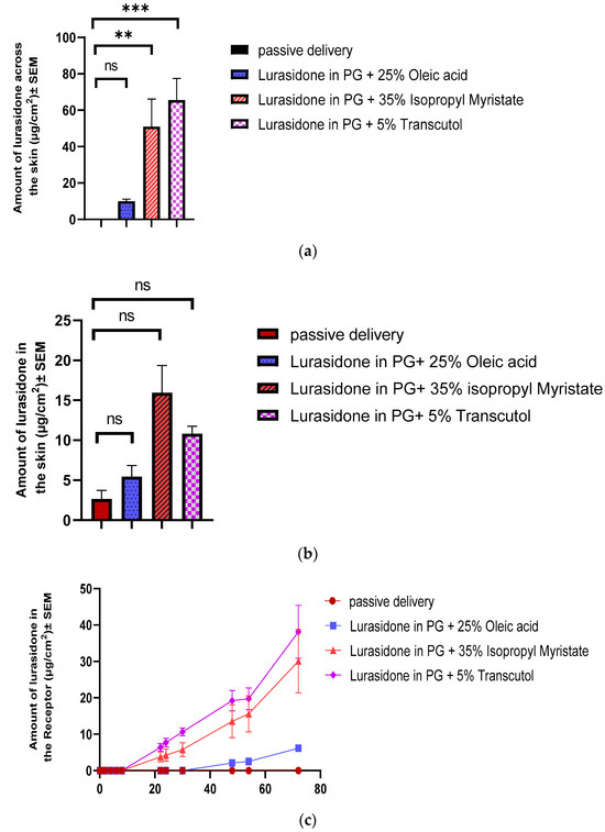 Evaluation of chemical enhancers for lurasidone delivery: (a) cumulative amount of lurasidone delivered into the receptor after 3 days; (b) amount of lurasidone delivered into the skin at the end of 3 days; and (c) permeation profile of lurasidone. Statistical analysis performed with one-way ANOVA; ns indicates no significant difference between groups, ** and *** indicate significant difference between groups, p < 0.05.