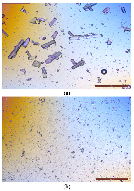 Moreover, homogenization was employed to improve the homogeneity of the suspension and increase its concentration of lurasidone in the formulation. After aiming for suspension, using homogenization, and incorporating transcutol in formulation, lurasidone concentration increased and was determined to be 738.6 mg/mL in the solution composed of PVA and PVP. Figure 5 illustrates the impact of homogenization on the lurasidone particles within the solvent.