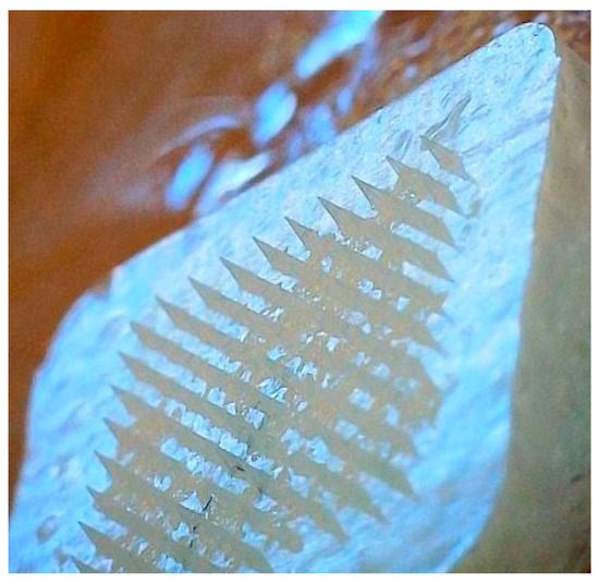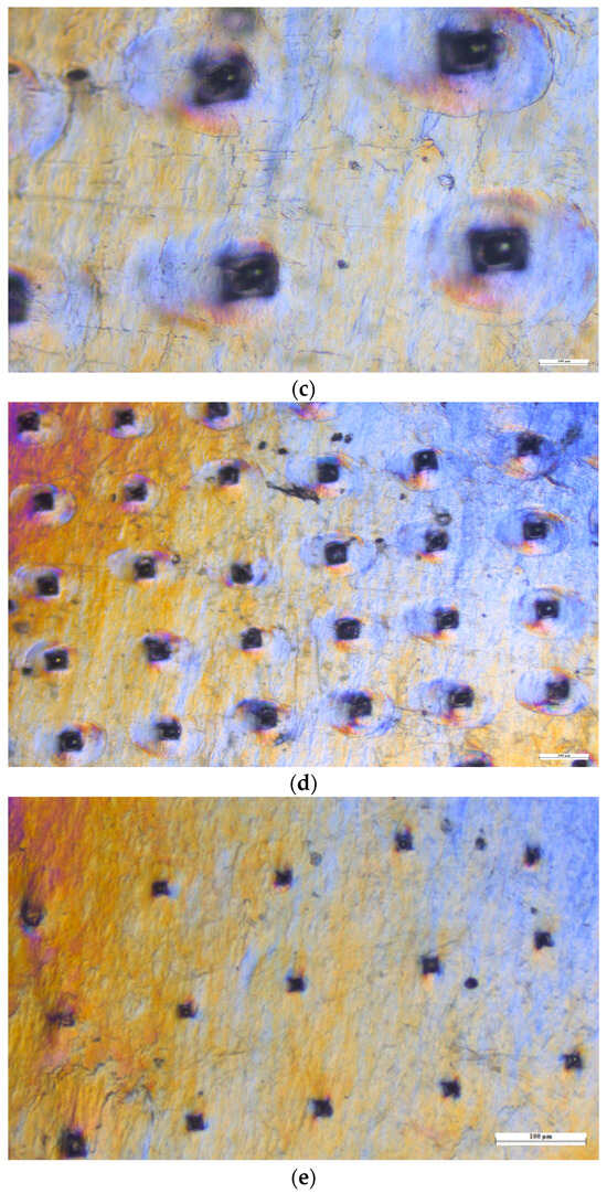 Parafilm M® was used as a skin mimetic substrate for in vitro insertion tests. The penetration capacity of various microneedle mixtures was evaluated using four parafilm layers, each having an average thickness of 0.124 ± 0.001 mm. After application, each Parafilm M® layer was separated by hand and analyzed using a Leica DM 750 optical microscope. If the needles successfully penetrated the third Parafilm M® layer, their hardness was considered sufficient for further analysis [34].