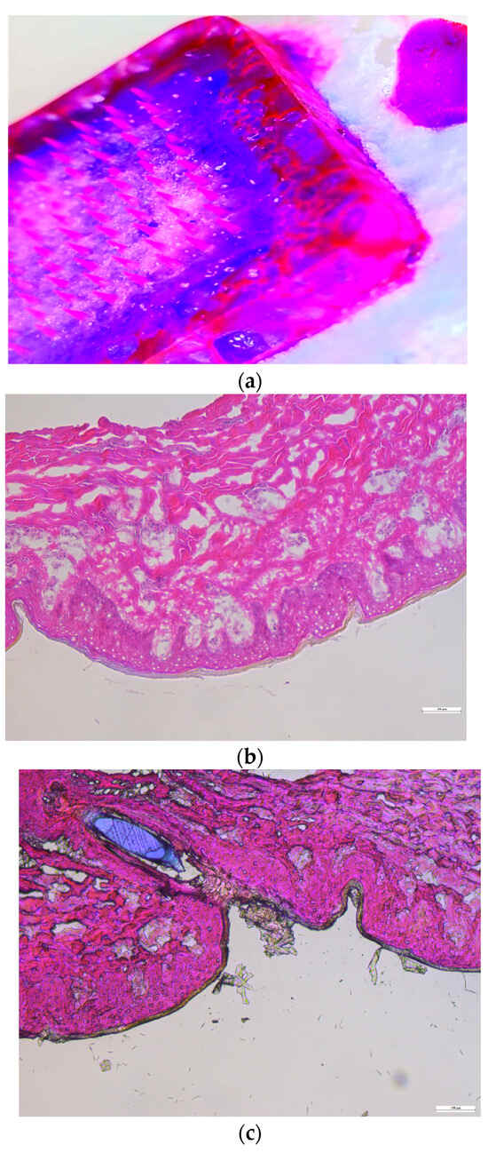Histological analyses were conducted on both intact skin and skin treated with microneedles. As illustrated in Figure 7, the tips of the microneedles were able to penetrate the stratum corneum. To enhance the visibility of the microneedles under the microscope during the histology study, 10 µL of Nile red was incorporated into the formulation of the microneedles.