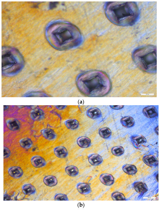 The mechanical consistency of the microneedles was examined using four layers of Parafilm M®. As illustrated in Figure 8, all 100 microneedles managed to penetrate the third layer of Parafilm M®. The resulting perforations in Parafilm M® took on a square shape, mirroring the pyramidal design of the microneedle tips.