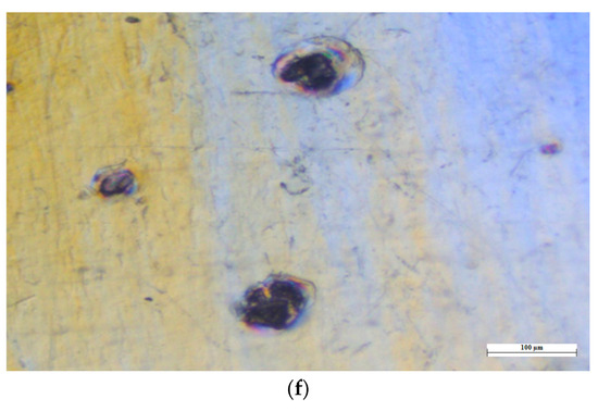 Microscopic views of the Parafilm M® layers. (a) First layer under 10× magnification. (b) First layer under 4× magnification. (c) Second layer under 10× magnification. (d) Second layer under 4× magnification. (e) Third layer under 4× magnification. (f) Fourth layer under 10× magnification.