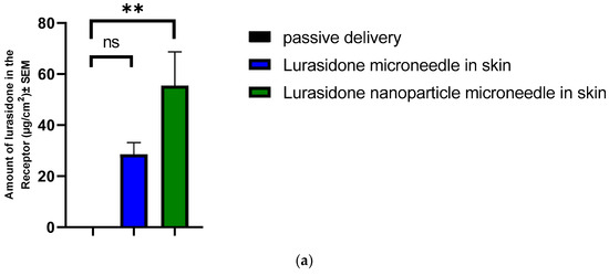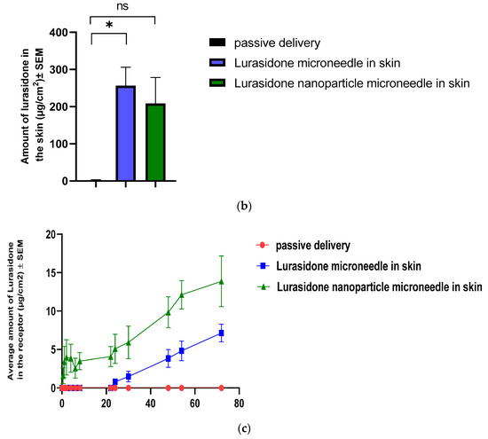 Evaluation of drug delivery from microneedles through the skin to the receptor: (a) cumulative amount of lurasidone delivered into the receptor after 3 days; (b) amount of lurasidone delivered into the skin at the end of 3 days; and (c) permeation profile of lurasidone. Statistical analysis performed with one-way ANOVA; ns indicates no significant difference between groups, * and ** indicate significant difference between groups, p < 0.05.