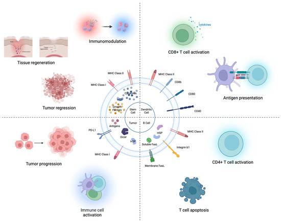 Intact EV therapeutics (X-derived EV). Stem cell-derived EVs contain various bioactive molecules (growth factors, cytokines, and heat shock proteins). These EVs exert effects on tumor regression, tissue regeneration, and immune modulation. DC-derived EVs contain antigen-presenting proteins (MHC I or II complexes). Mature DC-derived EVs can directly stimulate CD8 T cells and can activate CD4 T cells. B cell-derived EVs have MHC class proteins. B cell-derived EVs activate CD4 T cells and induce T cell apoptosis. Tumor-derived EVs harbor numerous molecules influencing immune activation (i.e., MHC class I, Antigens, and HSPs) or suppression (e.g., PD-L1, IL-10).