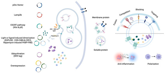 The development of active sorting delivery approach within EVs has been advanced by using fluorescence-mediated dimerization, Exosomes for protein loading via the optically reversible protein–protein interactions (EXPLOR). EXPLOR method use tetraspanin proteins [84]. In EXPLOR, CD9, a tetraspanin protein, conjugates with CIBN (a truncated version of the CRY-interacting basic-helix-loop-helix 1), and the protein of interest conjugates with CRY2 (cryptochrome 2). The interaction between CIBN and CRY2, which is regulated by blue light-dependent phosphorylation, allows for transient control. Using this technique, the super repressor IκB has been loaded into EVs to reduce mortality and inflammatory response, and to lower the risk of premature birth in a mouse model of sepsis [83,125]. In addition, ligand-mediated dimerization by Rapamycin-induced FKBP-FRB can efficiently sort Cas9-RNPs into EVs [126]. These various dimerization techniques have been explored to compare the loading efficiency of Cas9-RNPs and verify effective gene editing activity [127].
