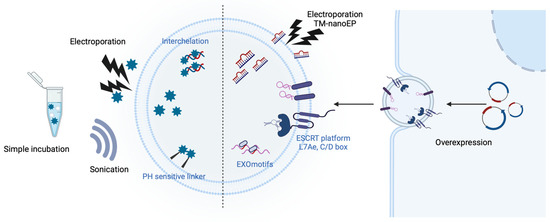 Concentration-dependent delivery involves protein overexpression in the cytoplasm through transfection, which induces excessive expression to allow partial loading during EV biogenesis based on the concentration. For example, macrophages transfected with plasmids encoding murine IL-10 secreted EVs containing IL-10, thus promoting M2-type polarization to prevent ischemic acute kidney injury [121]. This method is straightforward, but less effective for proteins located in the nucleus, such as transcription factors. They are primarily used as cytoplasmic proteins.