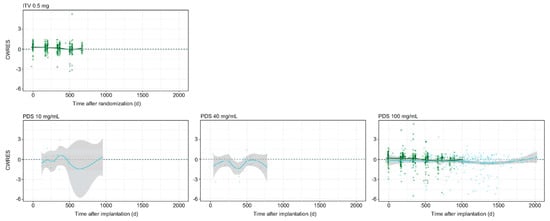 Graphs showing pharmacokinetics of classic ranibizumab (RBZ) 0.5 mg intravitreal injection (IVI) compared with the port delivery system (PDS) in the aqueous humor. (Courtesy of Kagedal et al.) [27]. Conditional weighted residual (CWRES) versus time after implantation (for PDS arms) or time after randomization (IVI arm) for aqueous humor nominal dose across clinical trials. Solid line indicates locally estimated scatter plot smoothing (LOESS), with the surrounding shaded area representing the 95% confidence interval. The blue points are the patients initially enrolled in the LADDER trial; the green ones are patients initially enrolled in the ARCHWAY trial.
