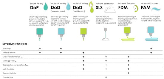 Classification of pharmaceutically relevant AM technologies and examples of the key polymer material properties affecting printability; modified according to [20]. The “+” indicates that the specific polymer function is important for the AM technology listed in that column of the table. DoP = drop-on-powder printing; DoD = drop-on-demand printing; SLS = selective laser sintering; FDM = fused deposition modeling; PAM = pressure-assisted micro-syringe.