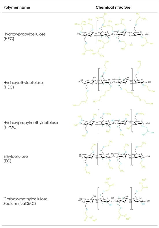 Cellulose derivatives are important excipients widely used in the pharmaceutical industry. This section provides an overview of pharmaceutically relevant cellulose ethers and their applications in AM. Cellulose is a polysaccharide of natural origin, composed of linear chains of 1-4-linked β-d-anhydroglucopyranose units of variable length, generally synthesized by plants, with wood and cotton fibers being the primary sources of cellulose for pharmaceutical applications. Due to intramolecular and intermolecular hydrogen bonds, cellulose is not soluble in water, although it is a highly hydrophilic polymer due its high degree of crystallinity and structure [115].