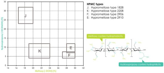 Hydroxypropyl methylcellulose or hypromellose (HPMC) is a cellulose ether prepared by reacting alkali cellulose in two steps: first, methyl chloride is added to introduce methoxy groups, followed by propylene oxide to introduce hydroxypropyl groups. Since the added hydroxypropyl group introduces a secondary hydroxyl group that can also be etherified during the manufacturing of HPMC, several types of HPMC are available with varying degrees of substitution (DS) and molar substitution (MS). The European pharmacopeia, USP/NF, and other pharmaceutical compendia differentiate the different substitution types of HPMC using four-digit numbers behind the non-commercial name (Figure 3), with the first two digits referring to the approximate percentage content (per weight) of the methoxy groups and the second two digits referring to the approximate percentage content of the hydroxypropoxy groups. From a commercial point of view, these different grades of HPMC were simplified by using single letters instead of four-digit numbers, i.e., “K” for HPMC 2208, “E” for HPMC 2910, and “F” for HPMC 2906. The molecular weight for all types of HPMC is in the range of 10–1500 kDa [117]. Since the viscosity of a HPMC solution corresponds to its molecular weight, the commercially available types add a suffix indicating the viscosity of a 2% aqueous solution (w/w) at 20 °C, followed by a designated “M” (multiplier of 1000) if needed, i.e., Benecel™ K100M hypromellose.