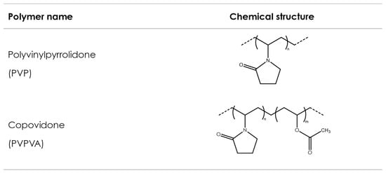 Polyvinyl polymers are synthetic amorphous linear polymers synthesized from formaldehyde and acetylene using the Reppe process to obtain N-vinylpyrrolidone (NVP) over different synthesis steps [134]. NVP is consequently polymerized either alone (to obtain homopolymers) or with other monomers (to obtain copolymers) using a free-radical polymerization step, induced by the addition of an initiator, which controls the final molecular weight of the synthesized polymer. Polyvinylpyrrolidone (PVP) is obtained from the polymerization of NVP solely, while vinyl acetate-vinylpyrrolidone copolymer (PVPVA) is obtained from the polymerization of NVP with vinyl acetate. Figure 4 shows exemplary chemical formulas for both polymers. Both polymers show favorable physicochemical characteristics, such as solubility in a wide variety of solvents, including water; ability to interact both with lipophilic and hydrophilic substances [135]; good adhesion properties; thermoplasticity; and low toxicity [136]. Consequently, they have been broadly used in pharmaceuticals—for example, as tablet binders [137], thickeners, and in the solubilization of drugs by forming amorphous solid dispersions [138]. In pharmaceutical AM, PVP and PVPVA have been used as suitable excipients in FDM, SLS, and binder jetting technologies.