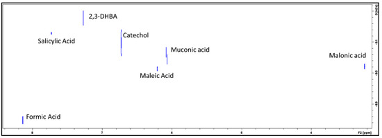 To validate the characterization of the degradants, DOSY spectra were used to generate an MW vs. LogD calibration curve to determine the approximate MW of the assigned degradant peaks (Figure 4). Combining the observed 1H signals with the DOSY spectra enabled the identification of the degradants [22,23,24] (Figure 4).