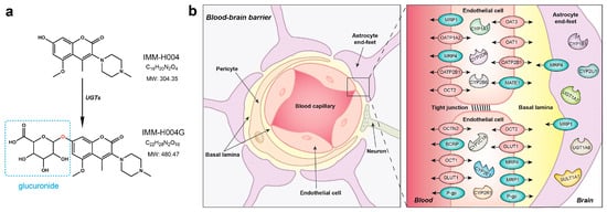 Generally, molecules with high lipophilicity and small molecular size can easily diffuse across the blood–brain barrier (BBB) following the concentration gradient [9]. Compared to IMM-H004, IMM-H004G is a highly polar and hydrophilic compound with a large molecular weight. However, brain exposure of IMM-H004G is significantly higher than that of IMM-H004. Due to its physicochemical properties, IMM-H004G is not favored for passive diffusion across the BBB, suggesting that it may depend on a transport system to reach high concentrations in the brain (Figure 1b). Additionally, it is widely recognized that during the transportation across the BBB, drugs have the potential to undergo metabolic transformations facilitated by drug-metabolizing enzymes that are present within the BBB [10]. Therefore, does the high brain exposure of IMM-H004G result from the in situ metabolism of IMM-H004, or is it transported into the brain through the BBB?