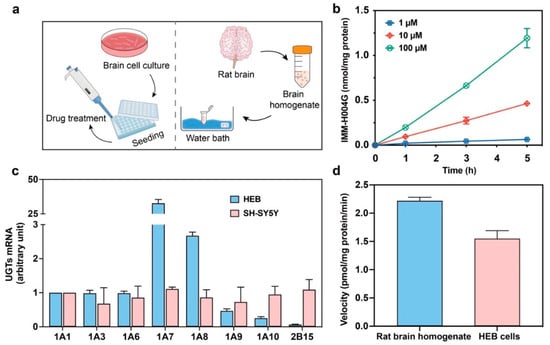 Metabolism of IMM-H004 and IMM-H004G in human brain cells and rat brain homogenate: (a) schematic diagram of the metabolism study in human brain cell lines and rat brain homogenate; (b) production of IMM-H004G when IMM-H004 (1–100 μmol/L) was incubated with HEB cells for up to 5 h (n = 2); (c) expression of UGTs mRNA in HEB and SH-SY5Y cells (n = 3); (d) in vitro generation rates of IMM-H004 to IMM-H004G in rat brain homogenate and HEB cells (n = 3).