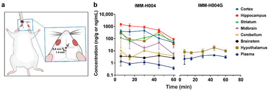 Metabolism of IMM-H004 after intracerebroventricular injection: (a) schematic diagram of intracerebroventricular injection. The red dot indicates the position of the bregma and the green pentagram represents the injection site; (b) concentration–time profiles of IMM-H004 and IMM-H004G in different regions of rat brain after intracerebroventricular injection of IMM-H004 at 3.8 μg/kg (n = 4).