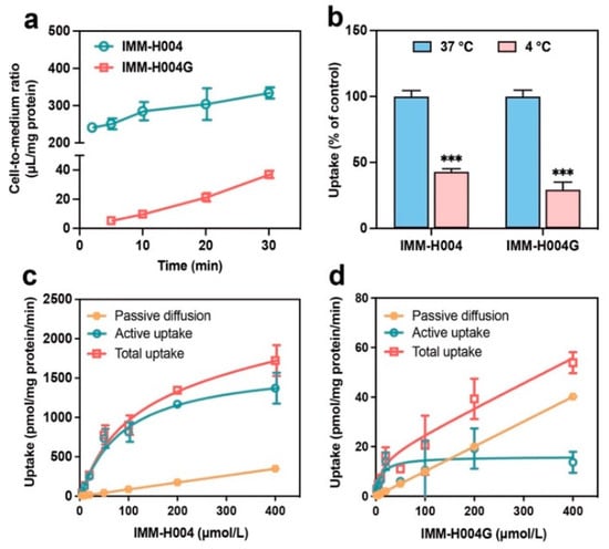 Brain microvascular endothelial cells constitute the blood–brain barrier and express various transporters to protect the brain against exogenous substances. The hCMEC/D3 cell line, derived from isolated human brain capillary endothelial cells, is widely utilized as an in vitro model for studying the transport mechanisms of drugs across the BBB. This is attributed to its expression of 144 SLC transporters and 23 ABC efflux transporters [34]. To investigate the transport characteristics of IMM-H004 and IMM-H004G across the BBB, a study was conducted on the uptake kinetics of IMM-H004 and IMM-H004G in hCMEC/D3 cells.