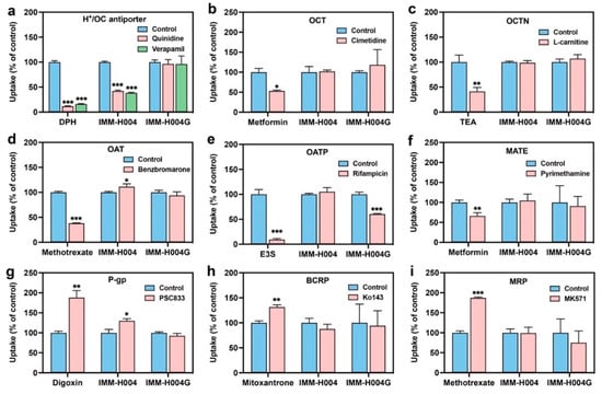 Effect of transporter inhibitors on the accumulation of IMM-H004 and IMM-H004G in hCMEC/D3 cells: (a) DPH (diphenhydramine, 1 μmol/L) is the substrate, and quinidine and verapamil (100 μmol/L) are the inhibitors of H+/OC antiporter; (b) metformin (10 μmol/L) and cimetidine (100 μmol/L) are the substrate and inhibitor of OCT, respectively; (c) TEA (tetraethylammonium, 20 μmol/L) and L-carnitine (5 μmol/L) are the substrate and inhibitor of OCTN, respectively; (d) methotrexate (10 μmol/L) and benzbromarone (10 μmol/L) are the substrate and inhibitor of OAT, respectively; (e) E3S (estrone 3-sulfate, 5 μmol/L) and rifamycin (100 μmol/L) are the substrate and inhibitor of OATP, respectively; (f) metformin (10 μmol/L) and pyrimethamine (1 μmol/L) are the substrate and inhibitor of MATE, respectively; (g) digoxin (5 μmol/L) and PSC833 (5 μmol/L) are the substrate and inhibitor of P-gp, respectively; (h) mitoxantrone (5 μmol/L) and Ko143 (5 μmol/L) are the substrate and inhibitor of BCRP, respectively; (i) methotrexate (10 μmol/L) and MK571 (10 μmol/L) are the substrate and inhibitor of BCRP, respectively. n = 3. *** p < 0.001, ** p < 0.01, * p < 0.05 vs. control group.
