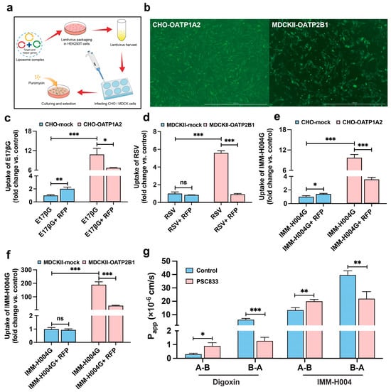 Transmembrane process of IMM-H004 and IMM-H004G mediated by P-gp and OATPs: (a) schematic diagram of the construction of transporter-overexpressing cells; (b) the photographs of green fluorescent protein (GFP) of CHO-OATP1A2 and MDCKⅡ-OATP2B1 cells, respectively, scale bar = 1000 μm; (c) E17βG (estradiol-17β-glucuronide, 5 μmol/L) was used as a positive group in CHO cells; (d) RSV (rosuvastatin, 10 μmol/L) was used as a positive group in MDCKⅡ cells; (e,f) the uptake of IMM-H004G (10 μmol/L) in OATP-overexpressing and mock cells; RFP (rifampicin, 100 μmol/L) served as a pan-OATP inhibitor; (g) the Papp values of IMM-H004 (10 μmol/L) in monolayers of MDCKⅡ-MDR1 cells. n = 3. *** p < 0.001, ** p < 0.01, * p < 0.05 vs. control group. ns, not significant.