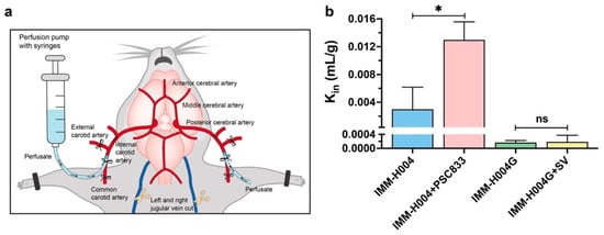 In situ brain perfusion of IMM-H004 and IMM-H004G in rats: (a) schematic diagram of in situ brain perfusion; (b) effect of P-gp and OATP inhibitors on the uptake characteristics of IMM-H004 and IMM-H004G using the in situ brain perfusion method. The concentration of IMM-H004 and IMM-H004G was 10 μmol/L. The concentrations of P-gp inhibitor PSC833 and the OATP inhibitor rifamycin SV were 5 μmol/L and 100 μmol/L, respectively. n = 3. * p < 0.05 vs. control group. ns, not significant.