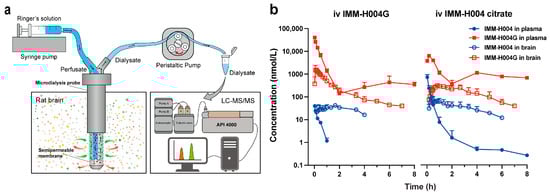 Pharmacokinetics of IMM-H004 and IMM-H004G in rats: (a) schematic diagram of the cerebral microdialysis technique; (b) free concentration–time profiles of IMM-H004 and IMM-H004G following intravenous injection of IMM-H004G and IMM-H004 citrate at a dose of 10 mg/kg (n = 3).