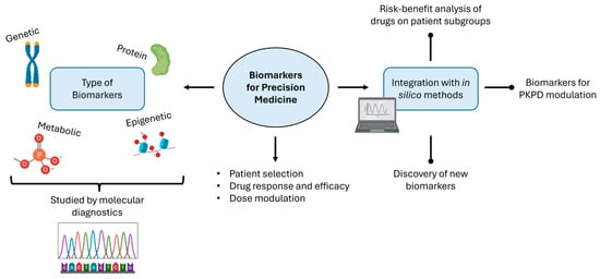 Biomarker integration in precision medicine and in silico approaches. Created with Biorender.com. Available online: http://biorender.com (accessed on 16 October 2023).