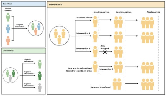 - Park, J.J.H.; Siden, E.; Zoratti, M.J.; Dron, L.; Harari, O.; Singer, J.; Lester, R.T.; Thorlund, K.; Mills, E.J. Systematic Review of Basket Trials, Umbrella Trials, and Platform Trials: A Landscape Analysis of Master Protocols. Trials 2019, 20, 572. [Google Scholar] [CrossRef] [PubMed]