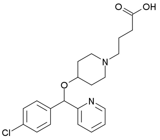 Bepotastine (BP) is a second-generation antihistamine prescribed as eye drops or oral tablets. It acts as an inverse agonist of the H1-receptors and downregulates allergic inflammation by interfering with histamine action [1]. Like other second-generation drugs, it does not cross the blood-brain barrier and rarely causes central nervous system-related symptoms [1,2]. Moreover, it has a fast onset of action of approximately half an hour [3,4], is excreted primarily through the kidney, and rapidly clears 75–90% of the dose within 24 h [5]. Owing to these advantages, it is widely prescribed to patients of all ages with allergic diseases. The drug is also prescribed as an ophthalmic solution and is contraindicated in patients with hypersensitivity reactions to its ingredients [5]. Some mild adverse events, such as nasopharyngitis, headache, and diarrhea, were reported in clinical trials [5,6]. No drug interactions are reported on the label [5,6]. The chemical structure of BP is presented in Figure 1.