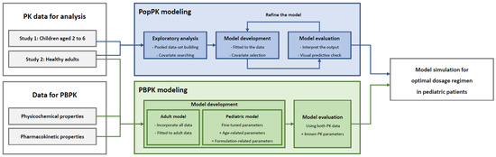 Conducting large-scale clinical trials in pediatric patients is complex, and pharmacokinetic (PK) modeling and simulation are increasingly being utilized as alternative methods to determine an appropriate dosing regimen [10,11,12,13,14]. Population PK (popPK) and physiologically based pharmacokinetic (PBPK) modeling are two widely used approaches, each with different strengths and weaknesses [10,11,12,13,14]. PopPK modeling is primarily driven by data and is relatively easy. However, extrapolation across species, age, sex, and medical conditions is difficult unless these factors are adequately addressed in the model-building stage. PBPK modeling, on the other hand, offers a potential solution to this problem because its predictions are firmly grounded in physiology [15]. The main drawbacks are the technical difficulty and longer time requirements for building the model, mainly owing to its heavy dependence on previously known drug-related and physiological parameters. Nevertheless, the situation is slowly changing with the development of various PBPK modeling platforms that provide reference databases for physiological parameter values. As such, there is increasing acceptance of using PBPK modeling to predict drug exposure in pediatric patients and adjust doses based on age and body weight [13]. From this perspective, we aimed to utilize both a popPK model that can adequately explain the population and a PBPK model to offer supplementary information regarding our pediatric patients, especially when there is insufficient physiological covariate data, to suggest a more reliable dose recommendation.