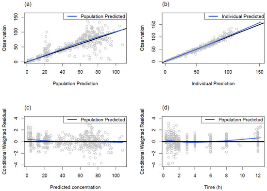 Goodness-of-fit plots of final popPK model. (a,b) black line: identity line; blue line: smooth, (c,d) black line: zero residual line; blue line: smooth.