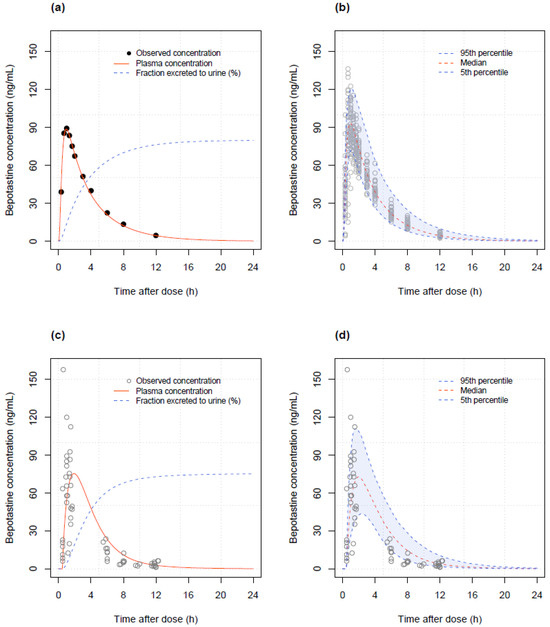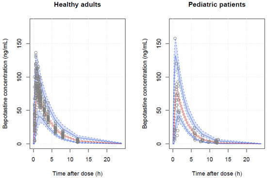Data were obtained from two prospective studies conducted at Severance Hospital (Seoul, Republic of Korea). One was an open-label, single-arm study to evaluate the safety and PK characteristics of pediatric patients aged 2–6 years, and the other was in healthy adults. These studies were approved by the Institutional Review Board of Severance Hospital, and performed in compliance with the Declaration of Helsinki. Thirty pediatric patients were administered 1.5 mL of BP dry syrup (2 mg/mL) twice a day for at least four days, while 32 healthy adults were administered a single dose of 10 mg BP tablets. BP concentration measurements obtained from all participants were used for the PK analysis. A sparse sampling scheme with two samples per pediatric patient was used to measure at different times: one at 0.5 h to 2 h post-dose and the other at 6–12 h post-dose. A total of 13 samples per healthy adult were measured for 24 h at pre-determined time points (pre-dose (0 h), 0.33, 0.67, 1, 1.33, 1.67, 2, 3, 4, 6, 8, 12, and 24 h). Among them, two samples obtained at pre-dose (0 h) and 24 h were excluded from analysis, as their values were below the limit of quantification (BLQ). To measure the plasma concentration of BP, peripheral venous blood was collected in a blood collection tube containing heparin and centrifuged (3000× g rpm, 4 °C, 10 min) within 30 min after collection. After centrifugation, only the plasma in the supernatant layer was separated and stored in the freezer at −70 °C until analysis. The plasma concentrations of BP were measured by liquid chromatography-tandem mass spectrometry using an Agilent 6460 Triple Quad mass spectrometer (Agilent Technologies, Santa Clara, CA, USA) in the positive electrospray ionization (ESI+) mode. The calibration curve was linear over the range of 1–1000 ng/mL (coefficient of variation%: 0.1–1.3, accuracy%: 94.3–106.0) with the lower limit of quantification as 1 ng/mL. Information on age, weight, serum creatinine level, estimated glomerular filtration rate (eGFR), and gender were also collected as potential covariates. The demographics of the two studies are summarized in Table 1.