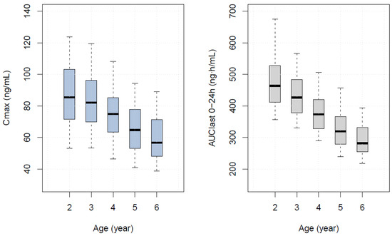 In the final PK model, the inter-individual variability in BP concentrations was well explained by body weight alone in children aged 2–6 years and adults. Considering the weight distribution of Korean children aged 2–6 years, simulations were performed for a total of 22 body weight values ranging between 10 and 31 kg [24]. Optimal doses increased with body weight, and AUClast-based doses were consistently higher in all sub-populations compared with Cmax-based doses. The appropriate doses for different body weights are presented in Table 3.