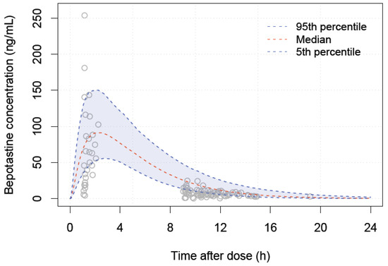 The final adult PBPK model explained the average value and distribution of the time-concentration profile well and predicted approximately 80% of the 24-h fraction excreted in the urine. The PK parameters, Cmax, AUClast, half-life, and Tmax estimated in the final adult PBPK model were 88.67 ng/mL, 374.65 h∙ng/mL, 2.69 h, and 0.95 h, which were similar to the reported values [26]. In the adult PBPK model with a 10 mg tablet applied, nearly all of the drug was absorbed in the intestine, and the bioavailability was calculated to be 93%. The final pediatric PBPK model well described our data with approximately 90% of the observations included in the 90% prediction interval. The Cmax, AUClast, estimated in the final pediatric PBPK model were 75.46 ng/mL, 350.63 h∙ng/mL given a 3 mg dry syrup, slightly lower than those estimated in adults administered 10 mg tablet. The half-life and Tmax were 4.08 h and 1.90 h, respectively, which were similar to those in adults. In the pediatric PBPK model, the bioavailability was estimated to be 95% and almost all medications were absorbed in the intestine as in adults. The predictions of the final adult and pediatric PBPK models are shown in Figure 5.