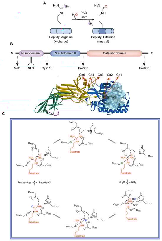 (A) PAD-mediated citrullination: conversion of arginine to citrulline in proteins catalyzed by PAD with the involvement of calcium ions. (B) Structure of the calcium-bound PAD4 monomer (PDB: 1WD9). (C) Proposed catalytic mechanism of PAD4.