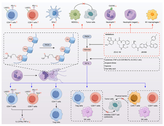 Novel role of PAD4 inhibitors in modulating antitumor immunity and immunotherapy. PAD4 inhibitors are directly involved in the regulation of the tumor immune microenvironment: (1) PAD4 inhibitors increase the expression of CD4+ T cells and CD8+ T cells and decrease the abundance of LAG3 and PD1 on their surface; (2) PAD4 inhibitors increase the expression of dendritic cells (DCs); (3) PAD4 inhibitors decrease the proportion of myeloid-derived suppressor cells (MDSCs) and indirectly lead to tumor cell suppression; (4) PAD4 inhibitors increase the expression of neutrophils, reduce their surface CXCR2, and reduced aged neutrophils (Naged); (5) PAD4 inhibitors increase the proportion of M1 macrophages; and so on. Indirect effects of PAD4 inhibitors on the immune microenvironment by inhibiting the production of NETs: (1) NETs lead to CD8+ T-cell and CD4+ T-cell dysfunction as evidenced by increased levels of PD-1, Tim3, and LAG3 as well as decreased production of IL-2, IFNγ, and TNFα; (2) NETs promote the differentiation of naive CD4+ T cells to Tregs; (3) NETs promote the immunosuppressive function of Tregs, NK cells, and CD8+ T cells; (4) NET-mediated physical barriers reduce the contact of CD8+ T cells, NK cells, and CAR-T cells, among others, with tumor cells, and so on.