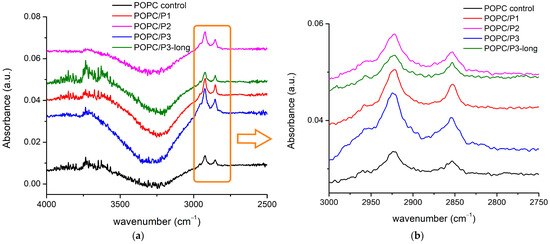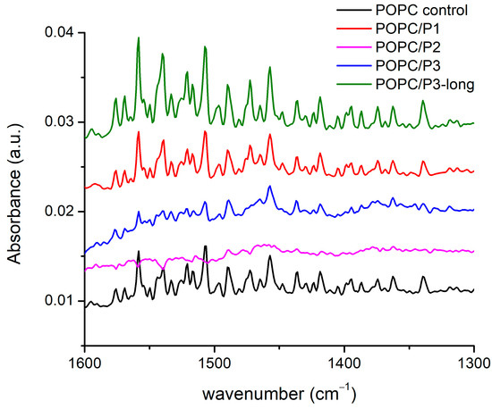 There are more than 20 registered modes in this region (Figure 4) arising from the CH2, CH3 and N-H-bending vibrations of different conformations including symmetric and asymmetric bond oscillations in and out of a specified plane, scissoring and waging, etc. [28,29,51,52,53,54]. Most of the bands overlap with one another, thus making difficult the exact assignment. Nevertheless, there are clear differences between the spectra: the lines are almost equivalent for the samples of pure POPC and POPC/P1, while for POPC/P3-long the modes become visibly more intensive and slightly narrower. The bands in the spectrum of the sample POPC/P3 diminish in intensity and are enlarged. The spectrum of POPC/P2 is almost flat in this region.