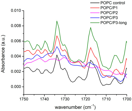 In Figure 3, the FTIR-ATR spectra of all the samples in the vicinity of the two ester carbonyl groups’ C=O-stretching vibrations are given. More than two constituent bands were registered, but the main doublets were seen around 1733 cm−1 and 1717 cm−1, and their possible splitting depends on their hydration status [29]. The two bands are informative also because they are associated with the two lipid tails. It has been established that the bands at lower wave numbers are attributed to the hydrogen-bonded ester group, i.e., to the unsaturated lipid chain (sn2), while the band at a higher wave number indicates a lack of H-bonding and is associated with the saturated chain (sn1) [29,55]. Both modes have their polarization along the double bond [51], i.e., they have to be sensitive to external interactions along this bond. The spectra in Figure 3 certify the strongest P2 influence on POPC molecules in the polar regions surrounding the lipid carbonyls (most likely via protonation [52]); the two C=O bands completely vanish. A possible interpretation can be that the peptide’s cyclic rings are situated near the acyl chains, being sufficiently bulky to create steric disruption in the glycerol group, hence providing the acyl chains with more space to move but without inducing any indicative order or disorder in the core. Moreover, the increase in the bandwidth of the C-H-stretching vibrations registered and described in the previous subchapter indicates an increase in the fluidity of the bilayer [30]. A comparable model has been suggested in [53,56,57], investigating an intercalation of tricyclic antidepressants into phospholipid membranes by NMR. Some phenylalanines have been reported to be located in the lipid core, significantly disordering the hydrocarbon chains [58] but not disturbing the glycerol group, while other peptides point to the headgroups [59,60].