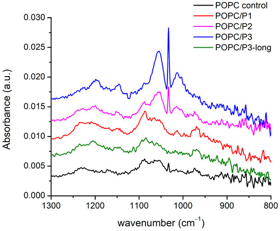 The spectral alterations as a result of POPC–peptide interactions are displayed in Figure 5 in the range of the active vibrations in the lipid headgroup. The modes include the usual low-frequency modes of oscillation in phosphate and choline groups: twisting, rocking, etc. The phosphate group is generally monitored via the O-P-O antisymmetric stretching mode, which is seen as a very broad band of about 1250–1150 cm−1. The phosphate group provides hydrogen-bonding acceptors, leading to a dependence of the spectral position on the hydration state of the headgroup: upon hydration, the asymmetric O-P-O stretching frequency decreases [29,51], whereas the broadening of the band is an indicator of polar headgroup mobility in the presence of the peptide [47]. In the complicated structure of this large band, a frequency decrease in the main peak of the asymmetric double-bond stretching O-P-O, adopting a maximum from 1229 cm−1 to 1197 cm−1, is seen through the samples. The lowest frequency is obtained for the most active peptide with β-alanine in the structure (P3).