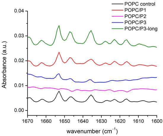 FTIR-ATR spectra of the aqueous suspensions according to the legend in the zone of the peptides’ Amide I, α-helix and β-sheets’ modes are presented in Figure 6: the doublet 1660–1640 cm−1 is assigned to Amide I of the α-helix, and the band at 1635 cm−1 is assigned to the Amide I of the β-sheets [52]. As it is seen, all three bands vanish completely for the sample POPC/P2. The analysis of the spectra shown above suggests a “soft” penetration of the phenyl rings of 1,8-naphthalimide in the lipid hydrophobic area thus presuming the oblique orientation of the helix correlating with the vibrational polarity in the choline group leading to the strong narrow peak at 1033 cm−1 (see Figure 5). This peak is maximal for the POPC/P3 sample, in which the maximal mobility in the lipid chains is registered, and it is not caused by peptides penetrating the core through the lipid interfacial carbonyl groups but probably by the strong electrostatic interaction in the headgroup vicinity. In Figure 6, this sample exhibits diminishing amide vibrations like in Figure 3 and Figure 4. In the POPC/P3-long samples, the spectral regions in Figure 3, Figure 4 and Figure 6 testify to a probable lateral association to lipid molecules without altering significantly the main lipid bilayer organization.