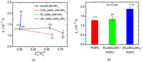Bending elastic modulus (weighed mean ± SD) of POPC membranes in the presence of (a) KLAKLAK-NH2 and its analogues at different total peptide-to-lipid molar ratios in the sample; (b) β-alanine containing peptides KLβAKLβAK-NH2 and (KLβAKLβAK)2-NH2 at 0.026 total peptide-to-lipid molar ratio (the number of GUVs given in brackets above each data point/column; * p < 0.005, -test of independence from the control).