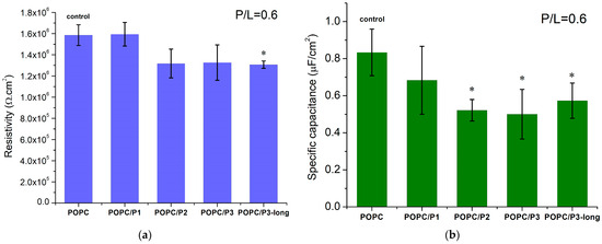 For a given peptide analog, at least three BLMs were prepared and impedance measurements were performed, with each of them averaged in over 10 repetitions. The weighted mean values with the corresponding standard deviations are presented in Figure 8. The POPC membrane resistivity obtained from the equivalent circuit fitting of the experimental data is coherent with the values for phosphatidylcholine bilayers, measured so far, ~106 Ω cm2 [34,76,77]. KLAKLAK-NH2 does not exert a measurable effect on the membrane resistivity, whereas all β-alanine-containing sequences induce a slight reduction in this parameter (Figure 8a). The substitution of alanines by β-alanines imparts additional positively charged side chains in the peptide molecule. Therefore, the formation of extra OH groups is expected around the positive choline headgroups as discussed above. A lower specific capacitance of KLAKLAK-treated POPC bilayers was measured for all peptide analogs at 0.6 peptide-to-lipid molar ratios in the samples (Figure 8b). While the obtained decrease for P3- and P3-long-treated membranes might be related to bilayer thickening, the reduced capacitance of P1- and P2-containing samples is likely due to lower dielectric permittivity. As reported from FTIR-ATR spectra, the bulky naphtalimid cyclic ring in the P2 molecule alters the aliphatic chain order in the hydrophobic core of the bilayer, which likely changes the dielectric permittivity of the lipid membrane.