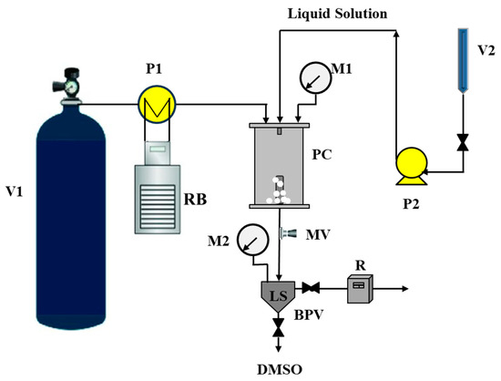 Figure 1 depicts the laboratory SAS plant, which includes a precipitation chamber (PC) with an inside volume of 500 cm3. CO2, which acts as an antisolvent, is supplied to the chamber from tank V1 via a pump (P1). The liquid solution is stored in a burette (V2) and injected into PC using a stainless-steel nozzle by means of the pump P2. Before entering the chamber, the CO2 is chilled in a refrigerating bath (RB). The pressure inside the PC is adjusted by a micrometric valve (MV) and checked using a manometer (M). A proportional–integral–derivative (PID) controller is connected to heating bands to maintain the desired operating temperature. A steel filter is positioned at the base of the PC and gathers the precipitated powder while enabling the CO2-DMSO mixture to flow through. DMSO is then reclaimed in a liquid separator (LS). The pressure within LS is controlled by a back-pressure valve (BPV). The flow rate is monitored by a rotameter (R).