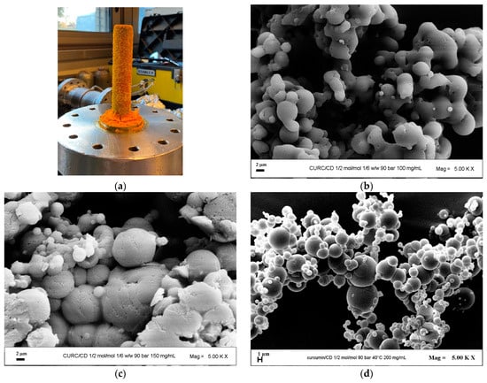 The effect of the total concentration was evaluated at P = 9.0 MPa and a curcumin/β-CD ratio equal to 1/2 mol/mol. Unlike when processing the active compound alone, the presence of the carrier allowed the attainment of powder at the opening of the precipitator, as can be seen from the photo shown in Figure 2a, reporting the filter covered with powder of an orange color typical of curcumin. As can be observed by the FESEM images, the increase in Ctot from 100 mg/mL to 200 mg/mL led to an evident variation in the morphology. Indeed, at 100 mg/mL (FESEM image reported in Figure 2b), the powder was constituted by coalescing particles; at 150 mg/mL (Figure 2c), there is an improvement in terms of sphericity of the particles which, however, are still slightly aggregated; only by setting the concentration at 200 mg/mL were very distinct microparticles obtained (Figure 2d).