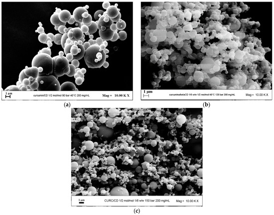 Once assessed that at 9.0 MPa and 200 mg/mL, well-defined microparticles are obtained using a CURC/β-CD molar ratio equal to 1/2, the micronization was attempted using an API/β-CD equimolar ratio (experiment #7 in Table 1). Indeed, it is well known from the literature that when cyclodextrin is used as a carrier, the obtained microparticles can consist of various units of complexes, and of the different guest/host configurations, the equimolar one is the most frequent [35,36]. Also, with a 1/1 mol/mol ratio, spherical particles in the micrometric range were obtained. As evident from the data reported in Table 1, when increasing the CURC/β-CD ratio, the mean particle size increased, and the particle size distribution enlarged. Considering that the powders coprecipitated at 9.0 MPa and 200 mg/mL at both ratios have the correct morphology and proper dimensions, the following analyses were performed on both.