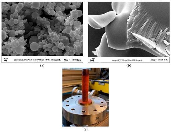 The first set of tests using PVP as the carrier was conducted by varying CTOT at P = 9.0 MPa and maintaining a CURC/polymer ratio equal to 1/2 mol/mol. A concentration of 20 mg/mL was chosen for the first test. Through the analysis by SEM microscopy of the samples, it was possible to verify the attainment of distinct particles whose average diameter is equal to 2.29 μm. The FESEM image of these particles is reported in Figure 4a. In the second test, a more concentrated solution at 50 mg/mL was injected, keeping the other operating conditions unchanged. At the end of the test, a moist powder with liquid was detected on the filter when the operating chamber was opened. In Figure 4b, a FESEM image that revealed the presence of crystals was reported, whereas, in Figure 4c, the filter’s picture after the precipitator’s opening showed the presence of a wet powder. It is therefore deduced that the increase in the concentration of the solutes at these operating conditions led to a shift of the mixture critical point toward higher pressure values. Therefore, the operating point fell within the miscibility hole. Considering that a concentration of 50 mg/mL led to an undesired morphology, the concentration was no further increased, and the following experiments were conducted at a concentration of 20 mg/mL.