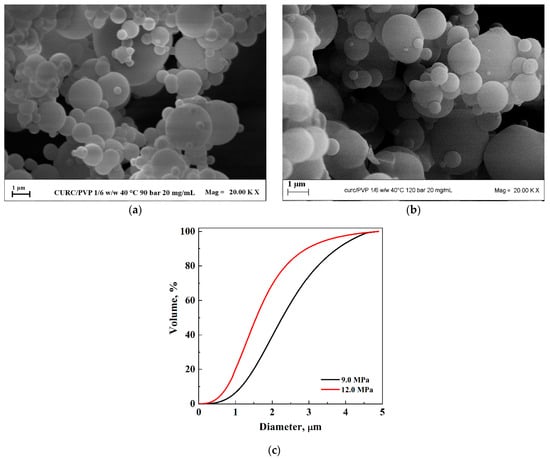 SAS powders of CURC/PVP processed at 20 mg/mL and 1/2 mol/mol. FESEM images with the pressure effect: (a) 9.0 MPa; (b) 12.0 MPa. Comparison of the cumulative volumetric PSDs (c).