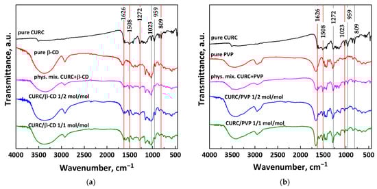 Comparison between the FT-IR traces of CURC-based powders: (a) inclusion complexes with β-CD and (b) coprecipitated powders with PVP.