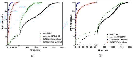 Comparison between the dissolution tests of CURC-based powders: (a) inclusion complexes with β-CD and (b) coprecipitated powders with PVP.