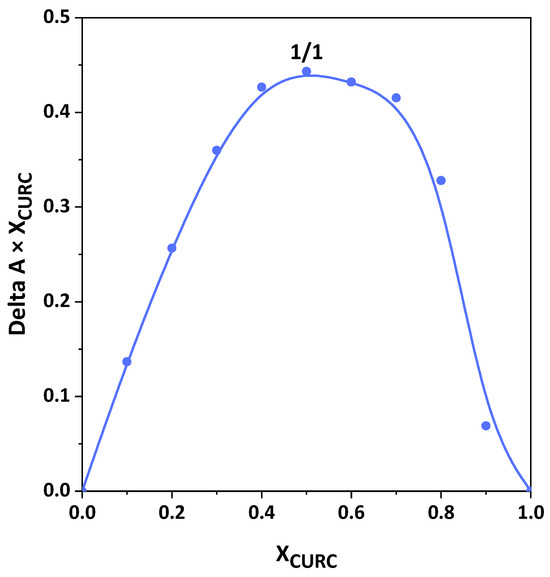 Evaluation of the stoichiometry of CURC/β-CD complexes through Job plot.